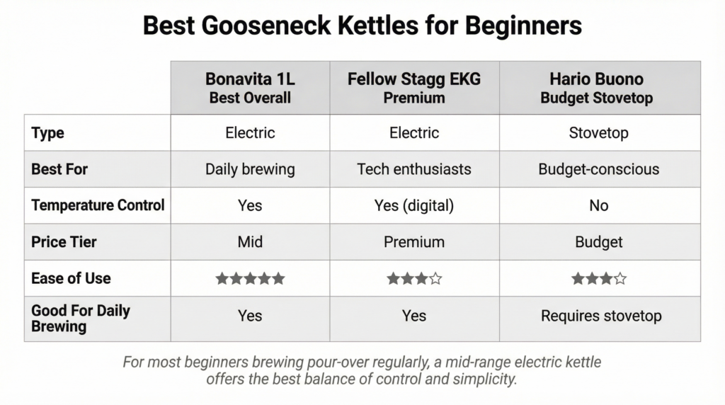 For most beginners brewing pour-over regularly, a mid-range electric kettle like the Bonavita 1L offers the best balance of control, ease, and value.